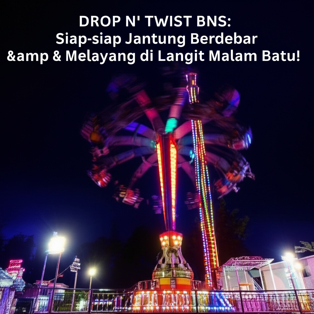 Malam di Kota Batu punya pesonanya sendiri. Udara sejuk pegunungan membelai lembut, sementara dari kejauhan, gemerlap lampu warna-warni mulai menyala, bagaikan bintang-bintang jatuh ke bumi. Dentuman musik ceria bercampur dengan tawa riang dan sorakan semangat, menciptakan atmosfer liburan yang tak terlupakan. Di tengah hiruk-pikuk kebahagiaan itu, menjulanglah sebuah menara gagah, menantang para pemberani untuk merasakan sensasi yang luar biasa. Inilah dia, Drop N’ Twist BNS, wahana yang siap membuat adrenalinmu terpacu maksimal dan memberikan pengalaman tak terlupakan melayang di atas indahnya Kota Batu di malam hari.