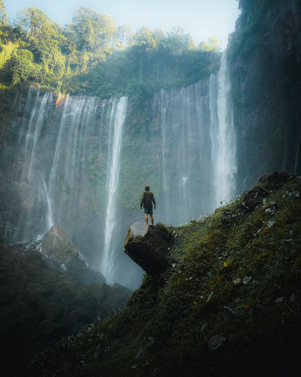 Tumpak Sewu Waterfall: Java's Majestic Curtain of Water Tumpak Sewu, often called "a thousand waterfalls," is arguably Java's most breathtaking waterfall, famous for its unique, wide, curtain-like formation. Water cascades dramatically down a massive semi-circular cliff face, creating a magnificent, multi-stream spectacle surrounded by lush tropical vegetation. Visitors can view its grandeur from a panoramic viewpoint above, or undertake a challenging, rewarding descent to the base to experience the immense scale and power of this natural wonder up close.